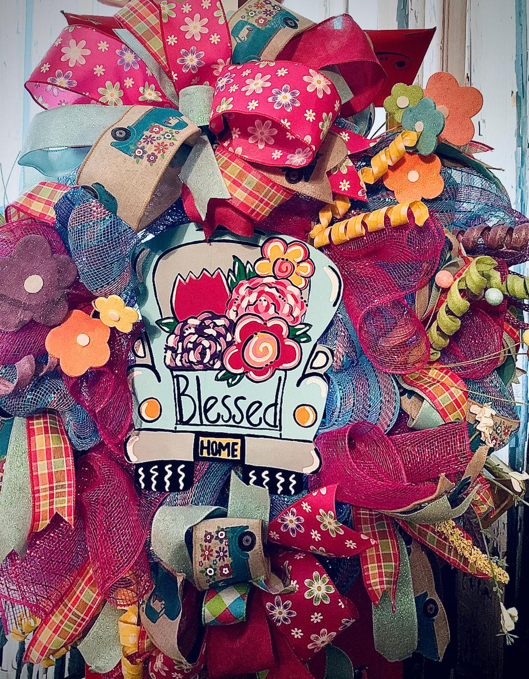 Everything about this cheerful wreath screams Spring! From the bright mesh, ribbons and flower embellishments you are immediately transported to a warm Spring day. The hand painted vintage truck is loaded with flowers ready to be planted. The tailgate reminds us that we are indeed Blessed. Want your truck's tailgate and license plate to say something different? No problem. Just let us know and we can easily customize for you. This uplifting wreath will instantly transport your visitors to a sunny Spring day!