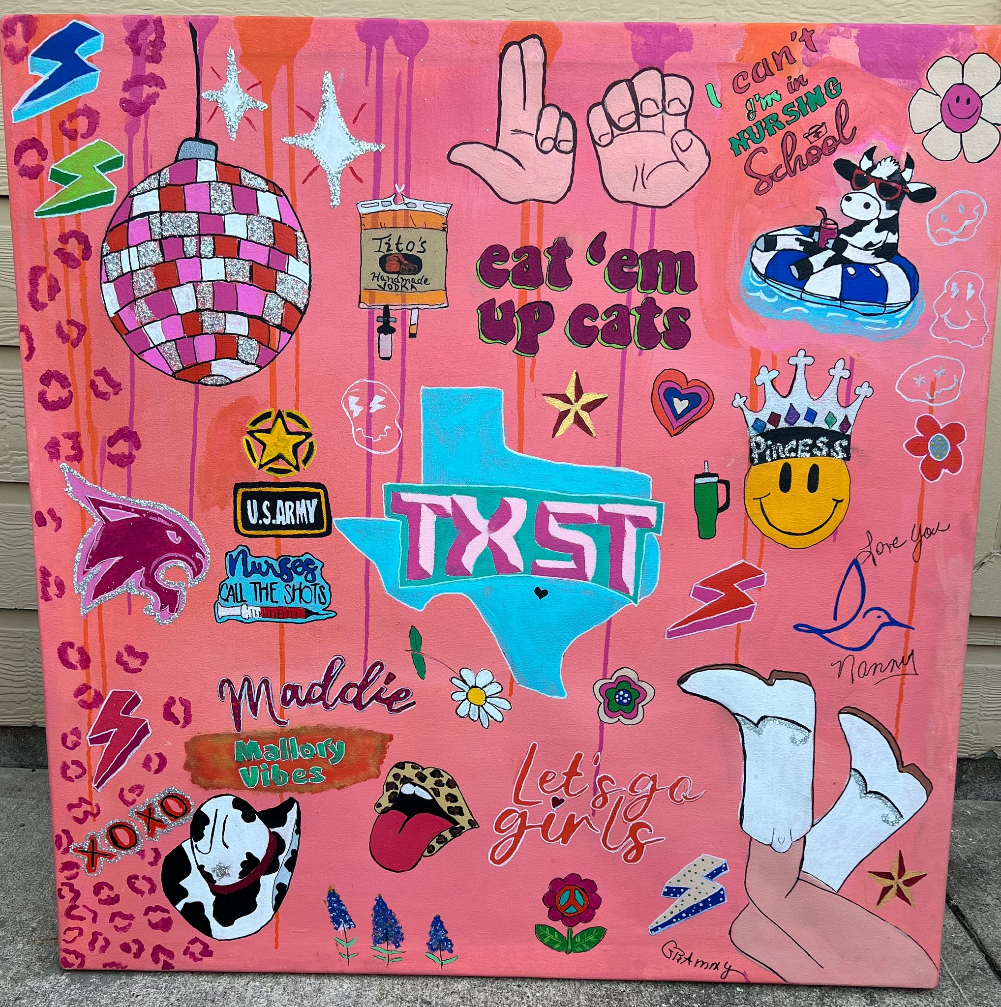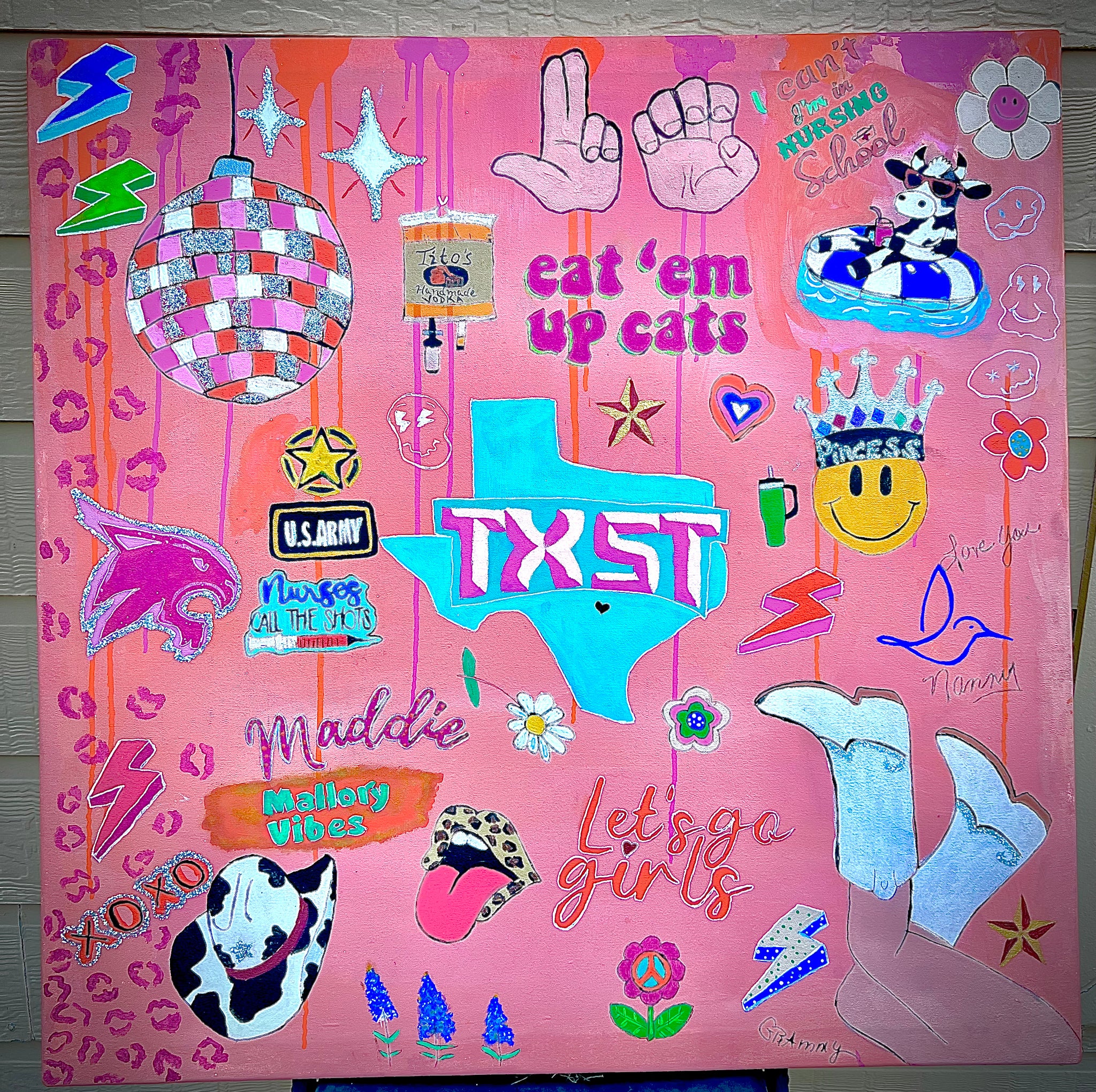 These custom canvases are the must have for any college dorm room or any room to showcase your school spirit, hobbies, sports or any idea you can image! Show off all the things that make you, YOU!! Each canvas is hand painted and tailored with you in mind. You decide what goes on your show stopping centerpiece! Prices vary depending on size of canvas and number of specific elements added. Please note: Due to the handmade nature of each canvas, no two can be identical.