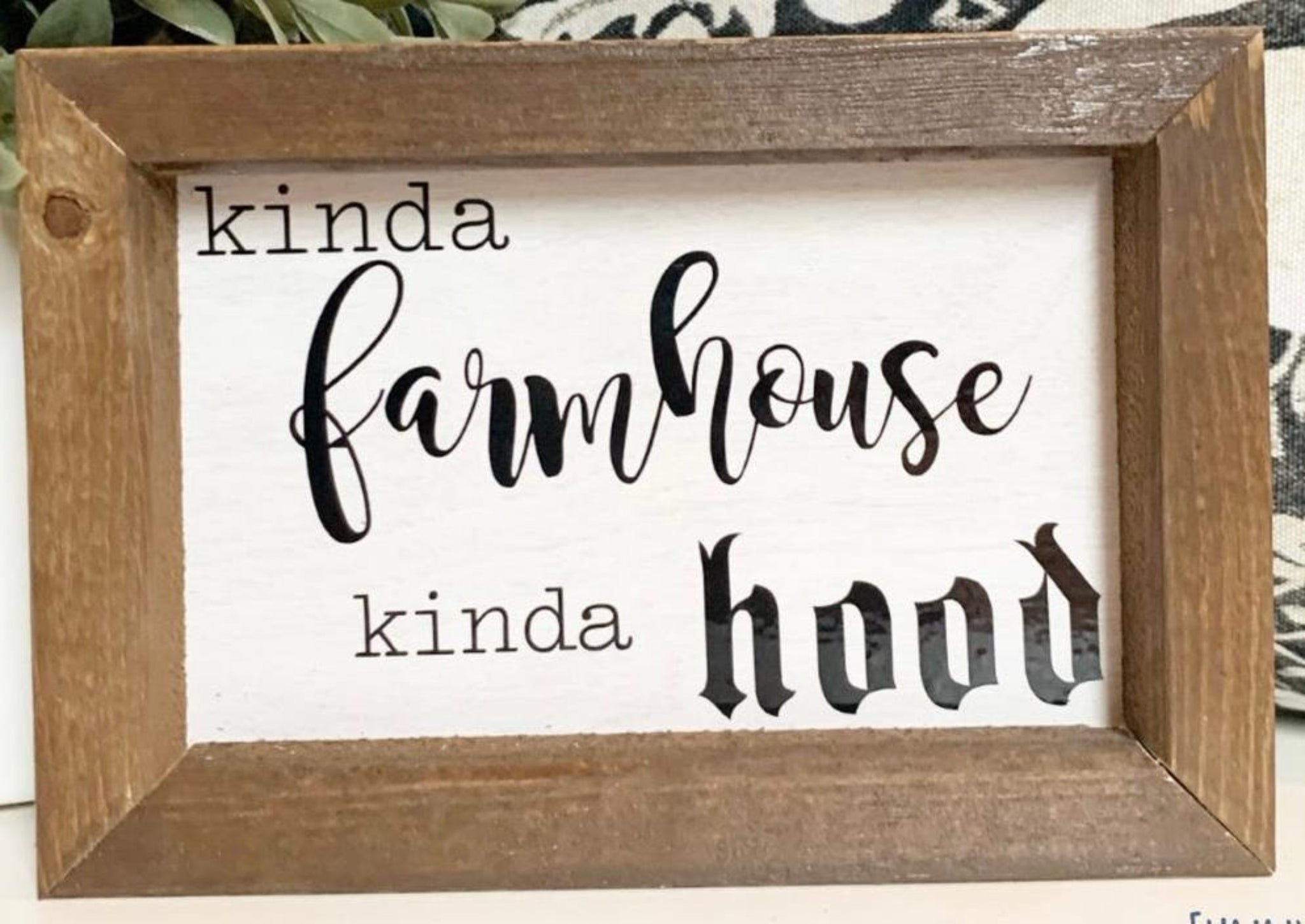 Kinda Farmhouse Kinda Hood wood framed sign. This cute & funny sign is sure to be hit whether gifting or keeping for yourself. This hand painted sign can stand on a table top or can hang. 2 size options are available.
